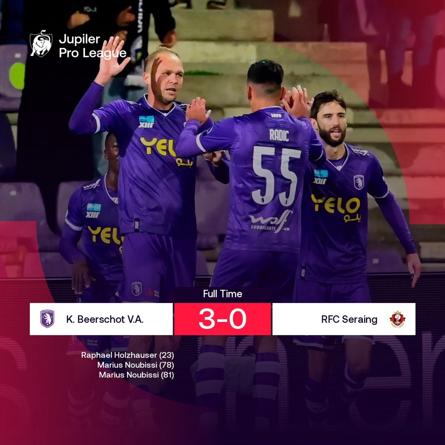 Свершилось: «Берсхот» одержал первую победу в чемпионате, причем безоговорочную! Аутсайдер лиги превзошел соперника и по счету, и по количеству (и качеству) ударов – а «Серену» никак не помогло значительное превосходство во владении мячом (61%). Тем не менее, в первом тайме «Берсхот» забил лишь один мяч. Довести дело до разгрома помогла удачная замена: Нубисси вышел на 76-й минуте вместо Шенкленда. Как сообщают бельгийские коллеги, нападающего встретили свистом собственные болельщики, недовольные его результативностью, но Мариуса это не смутило: он решил ответить делом и всего за пять минут после появления на поле отличился дважды! А уже в добавленное время дубль мог оформить и Хольцхаузер, но его удар с пенальти отразил Дитш.