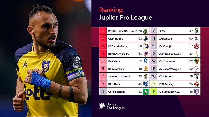 «Юнион» остается абсолютно лучшей выездной командой лиги: он набрал в гостях 41 очко из 48. «Брюгге», в этом рейтинге тоже идущий следом, заполучил 33 балла из 48.