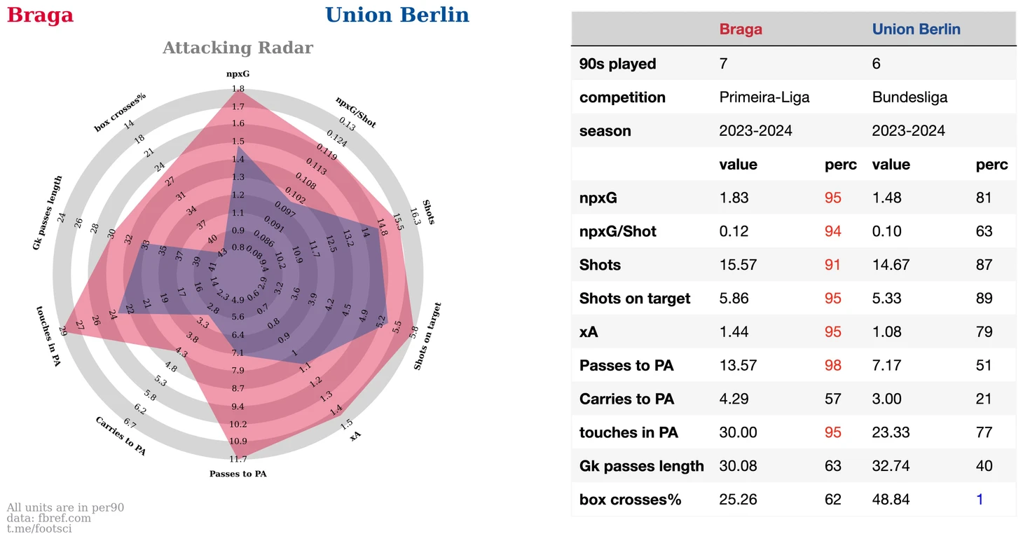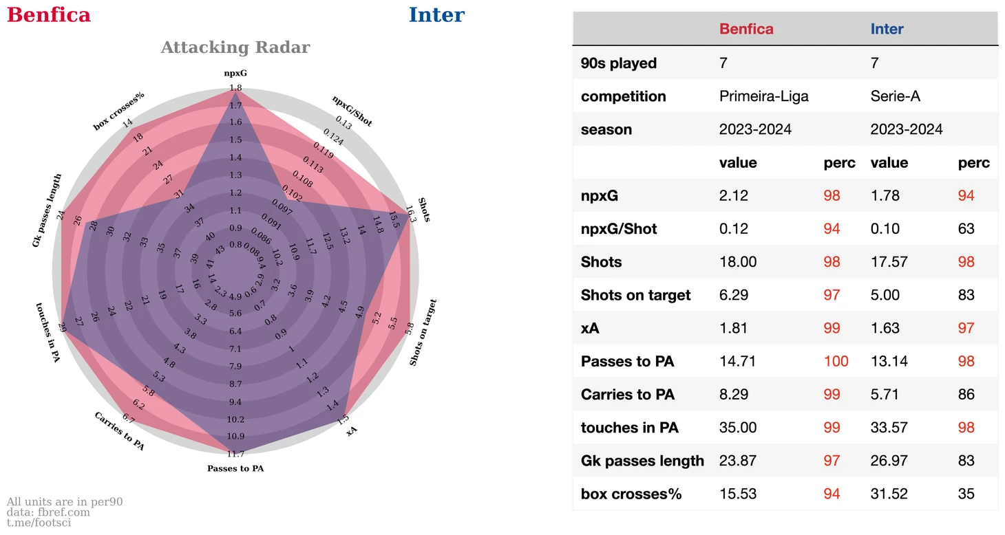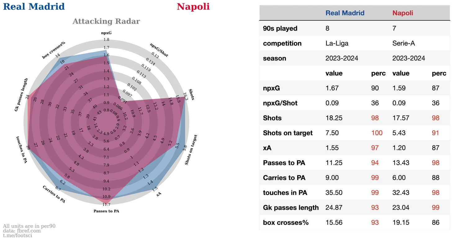 Ниже представлено сравнение базовых статистических показателей для нескольких игровых пар предстоящего раунда лиги чемпионов. Данные получены с сайта fbref.com. Визуализация - доработанная open source библиотека для построения радаров по шаблонам StatsBomb.