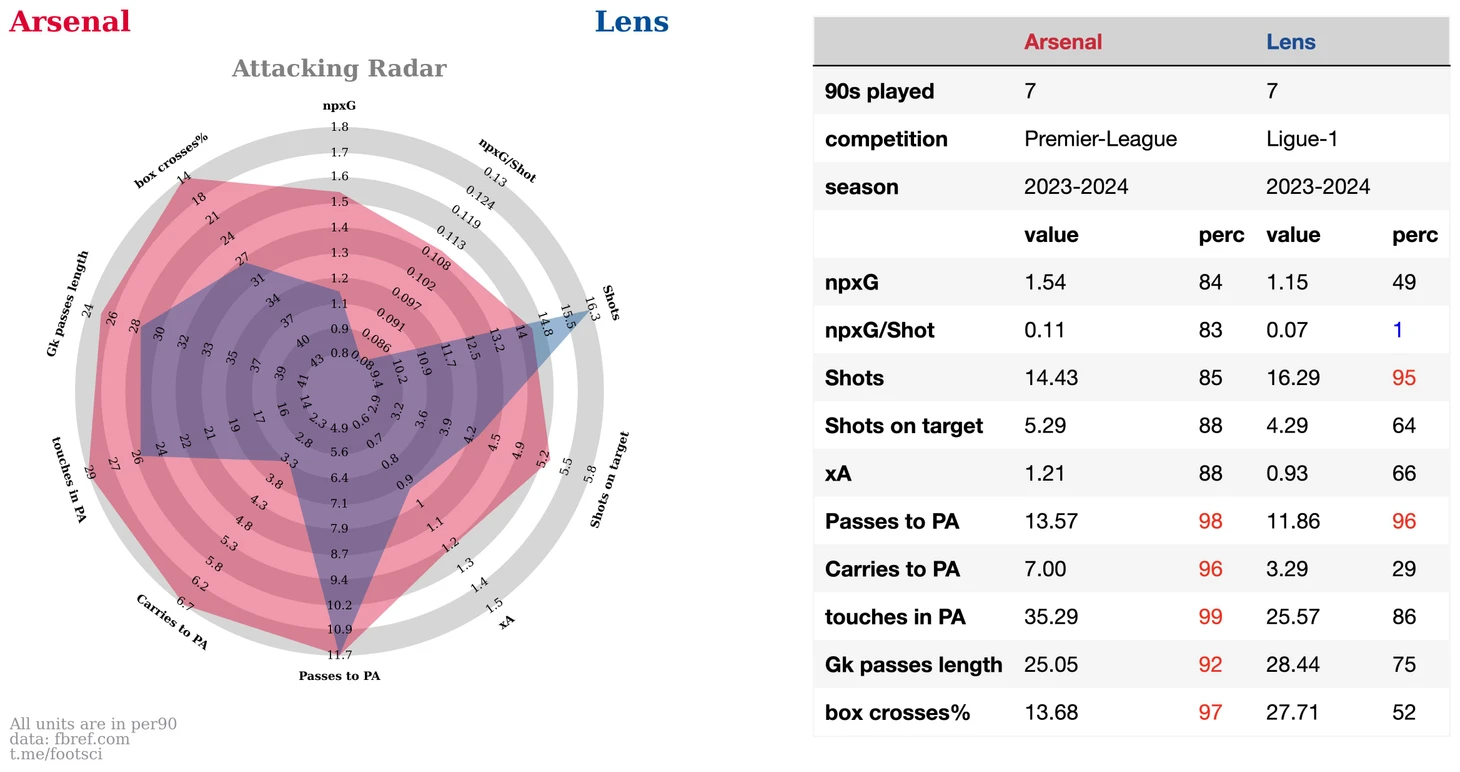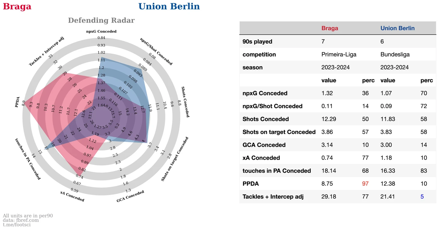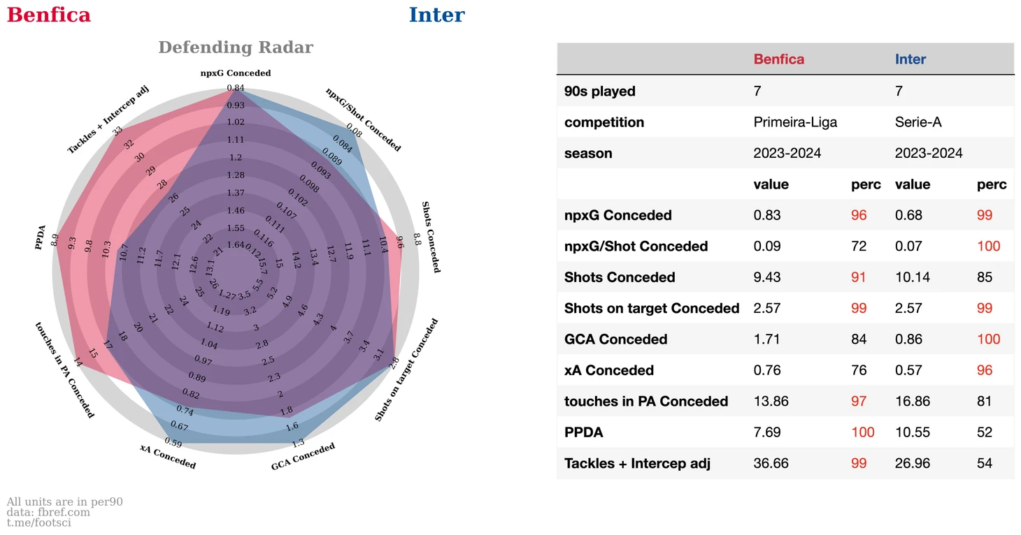 Ниже представлено сравнение базовых статистических показателей для нескольких игровых пар предстоящего раунда лиги чемпионов. Данные получены с сайта fbref.com. Визуализация - доработанная open source библиотека для построения радаров по шаблонам StatsBomb.