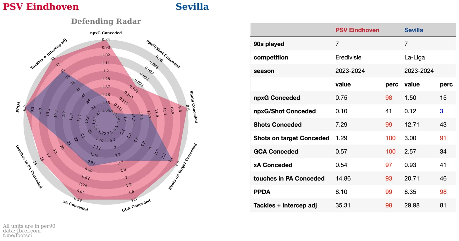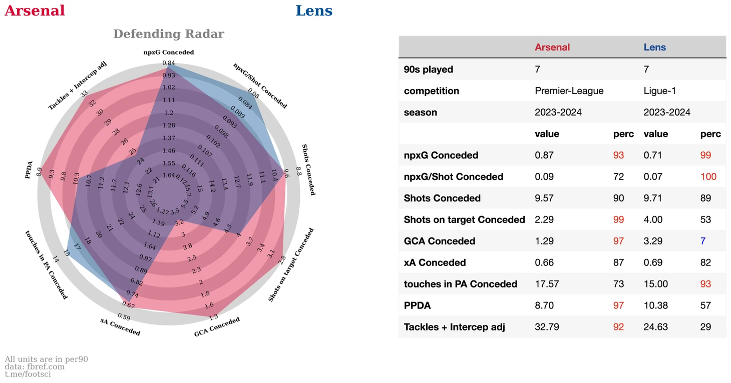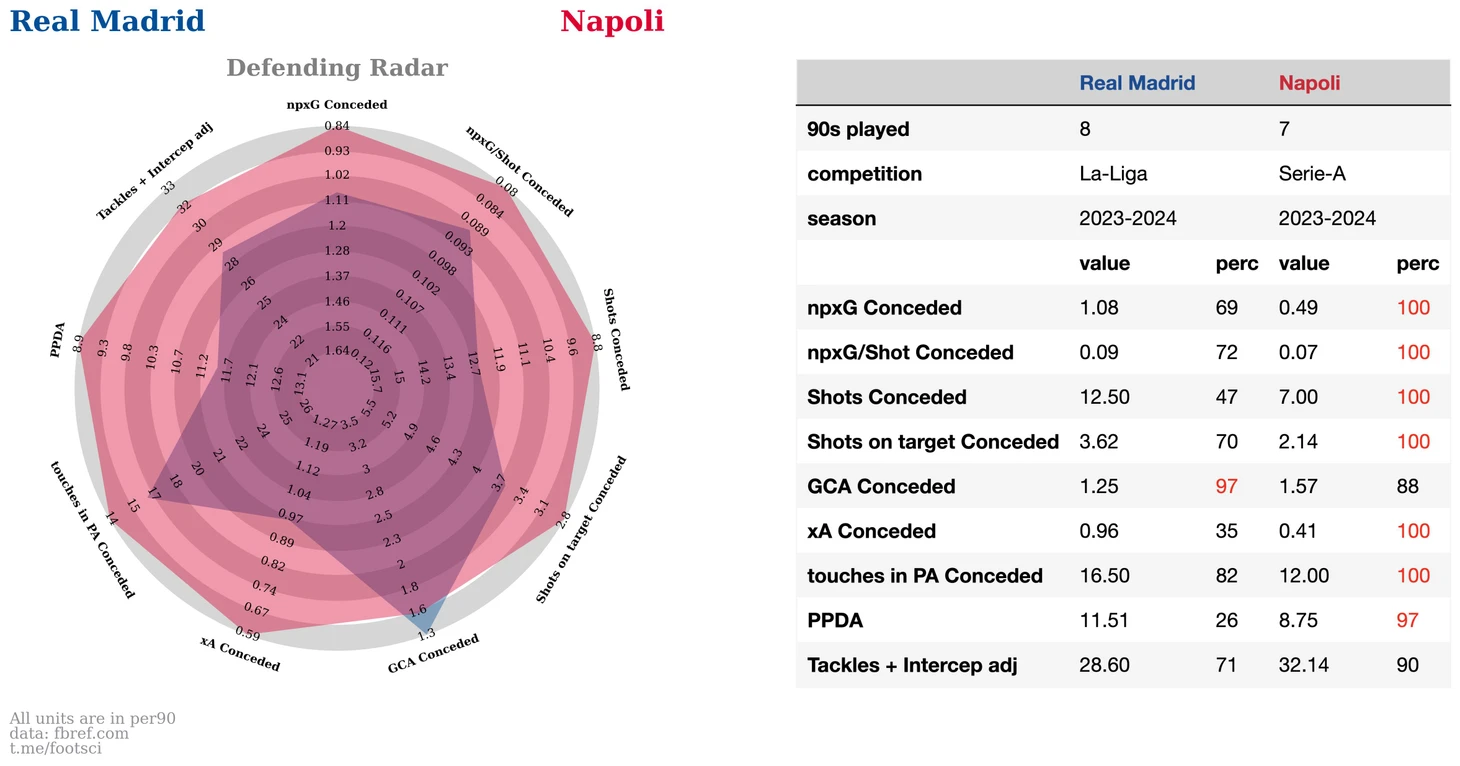 Conceded - суммарное значение соответствующей метрики, которое заработали соперники соперники команды, для которой рассматривается радар.