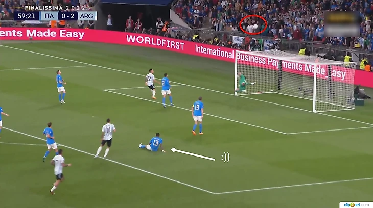 Первый опасный голевой момент Италии возник на 19-й минуте. Федерико Бернардески очень опасно прострелил с левого фланга! На повторе стало ясно, что до мяча нападающий даже и не дотянулся, но выглядело очень опасно! А Кристиан Ромеро сыграл очень уверено 👍🏻