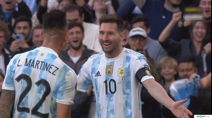 А ещё через несколько минут стремление Аргентины и воплотилось в забитый мяч. Капитан получает мяч почти в своей любимой зоне (только не на правом, а на левом фланге), моментально разворачивается, уворачивается от всех попыток Ди Лоренцо повалить его даже уже и в самой штрафной, вбегает с защитником на плечах, простреливает с левой - и врывающемуся во вратарскую Лаутаро остаётся только хорошо замкнуть мимо голкипера. Вот это игра Месси, вот это техника, вот это стремление идти не на пенальти, а на чистый забитый мяч! Ну что тут ещё скажешь :)