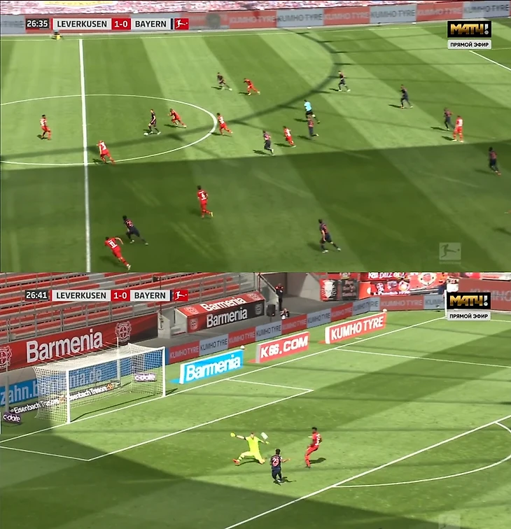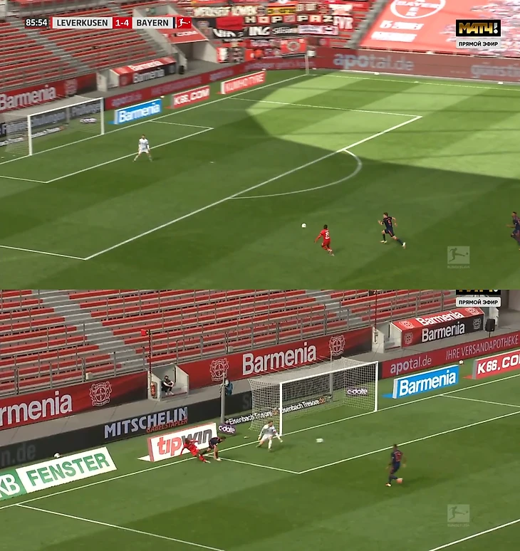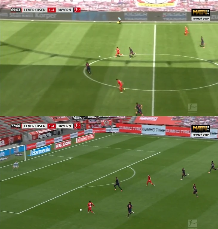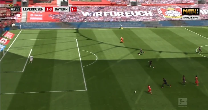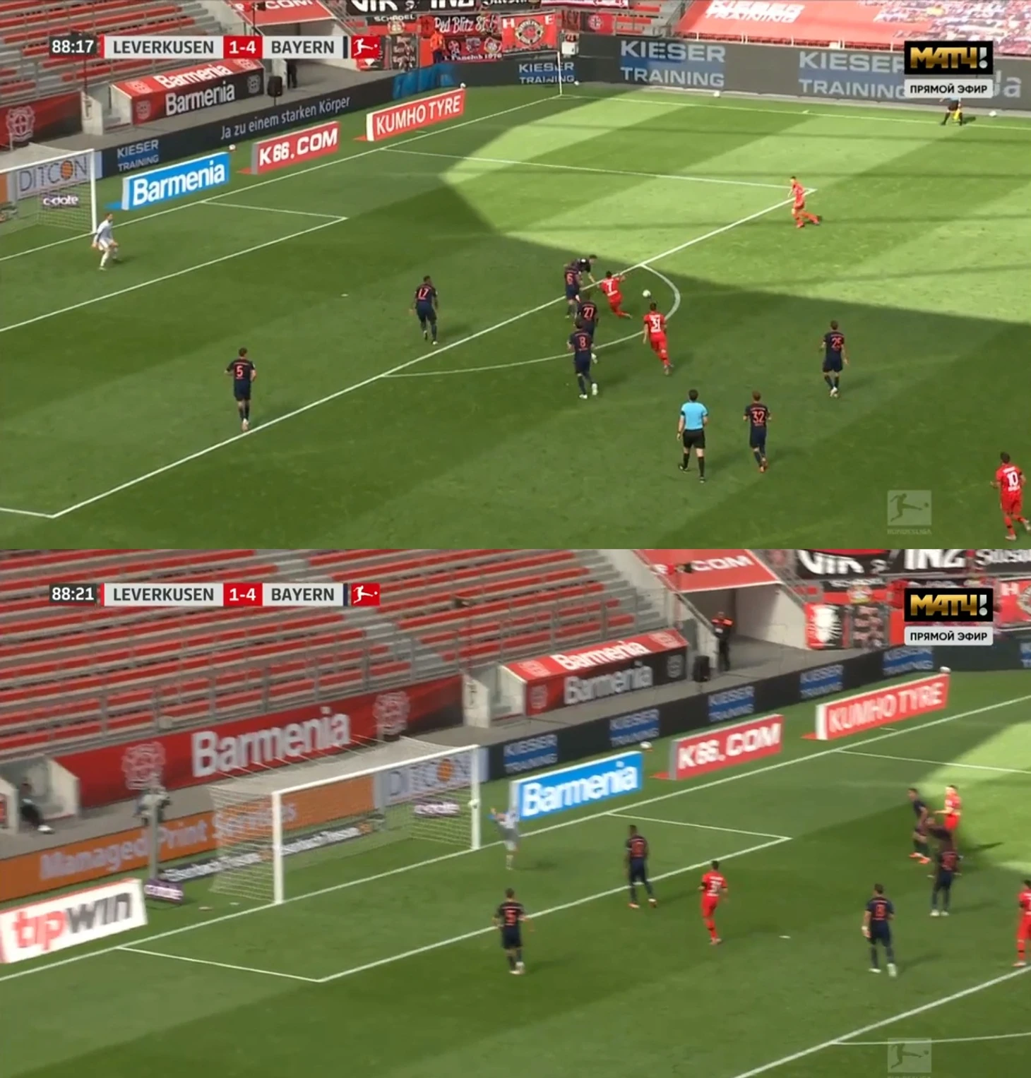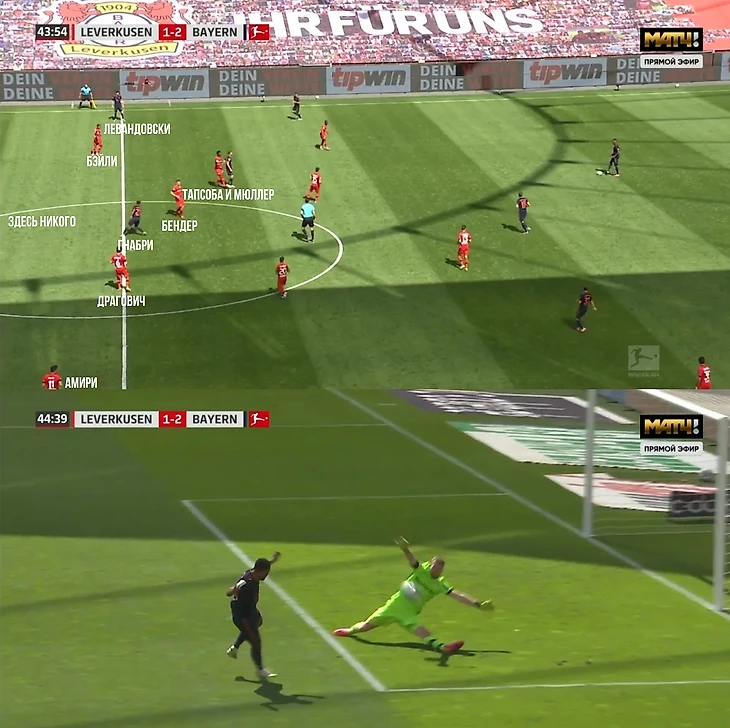 Ну и итог всему этому – ответный гол. «Байер» до этого все же остерегался выходить защитой к центральному кругу, а тут мяч еще и находился практически у его границ. Чего их туда понесло – непонятно. Особенно Драговича, хотя с его скоростью тоже бы ничего не спасло. Прекрасный отбор мяча Горетцкой у Диаби (перед которым пробегал Бэйли, а он был открыт для предложения), выход 2 в 3 с той открытой зоной, где Амири (в общем-то, не обладающим сверхскоростью), остается в дураках против реактивного Комана. Кингсли еще потрепал самое мгновение нервишки фанатов «Баварии», так как долго подстраивался под мяч перед выбежавшим Градецки. Вот решили еще раз результативно аут разыграть.