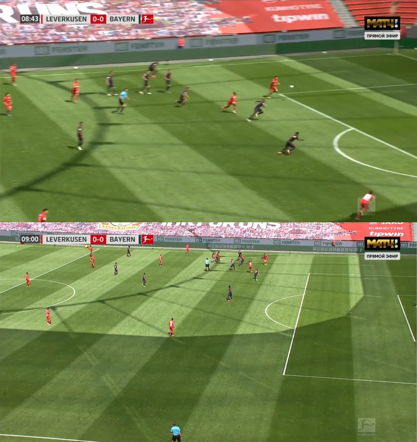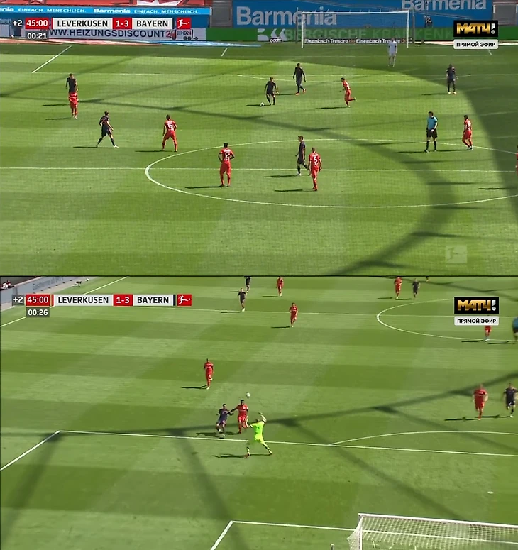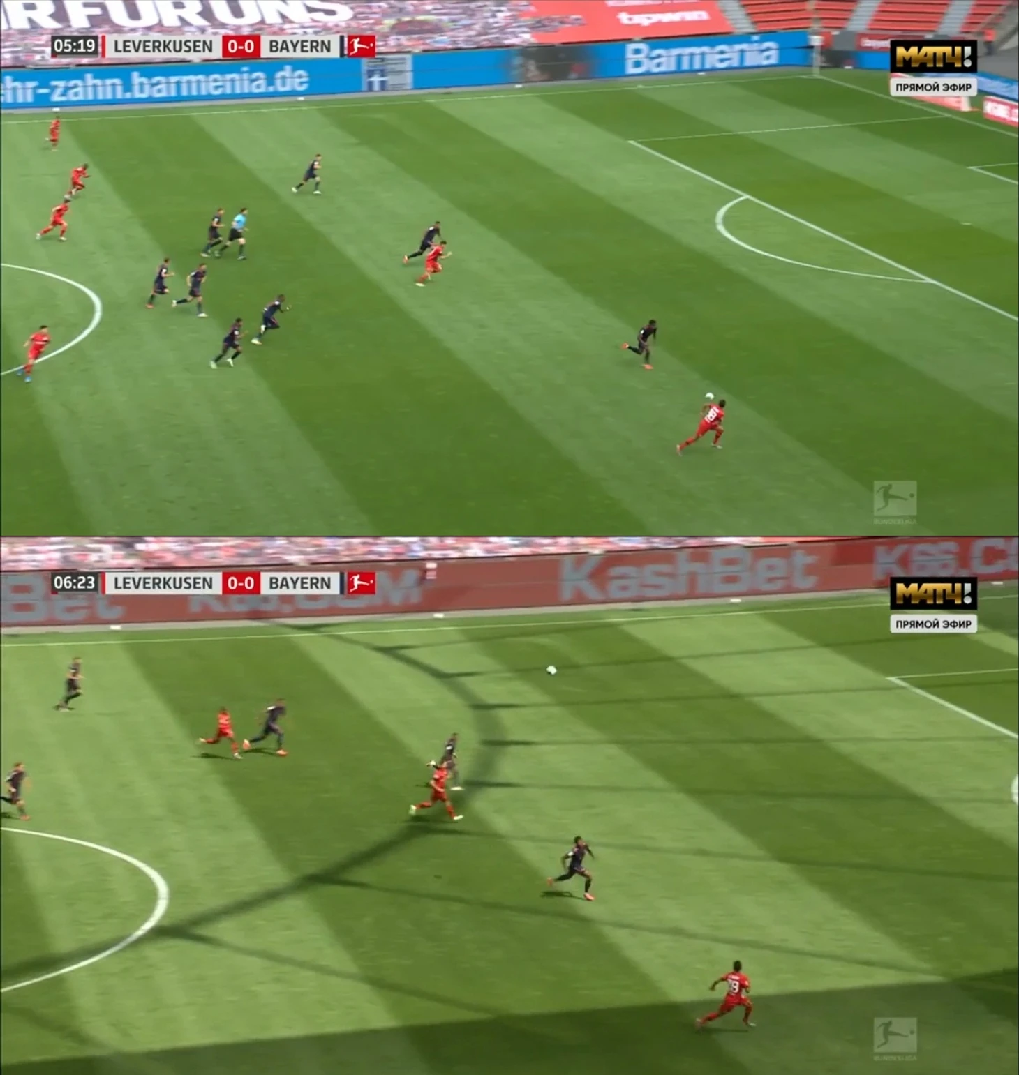 С первых минут «Бавария» побежала на чужую половину поля, и при этом «Байер» мгновенно раскрыл главный план на игру. Вне зависимости от ситуации, на мяч, которым владел Леон Бэйли у себя слева, должны были стягиваться мюнхенские игроки, а он уже отправлял длинные продольные передачи на другой фланг + на чужую половину поля к Бельараби. Это действительно работало, так как на это не раз и не два купился Альфонсо Дэвис, слишком высоко игравший по ситуации. Забросы шли весь матч, но больше всего их было в первые 10-15 минут – игроки «Баварии» оттягивались так близко к мячу, что зоны были очень обширные, и если бы Карим действовал, что называется, порезче, то у «Баварии» были бы большие проблемы.