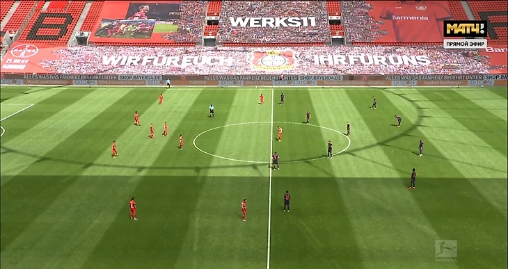 Для начала – великолепный перформанс от работников стадиона. Объективно лучшая экспозиция в Бундеслиге. От такого «Бай-Арена» уж никак не выглядела пустынно.