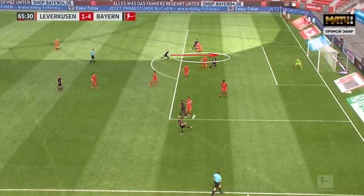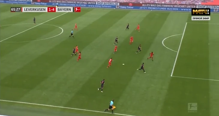 А затем здесь. Его даже в кадре не было! Зато в кадре был Тапсоба и остальные, которые вновь решили выйти к центру поля. При счете 1:2 не в свою пользу. Играя против «Баварии». Кайф вообще. Простейший гол. А все потому, что нет персональной опеки за фланговыми игроками.