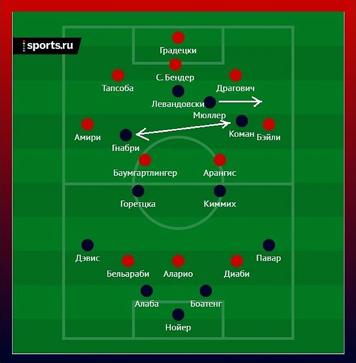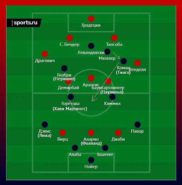 У «Баварии» все чинно – которую игру подряд играет один и тот же состав. К слову, последнюю, но к чему вам спойлеры. Мюллер по-прежнему чувствует себя как рыба в воде без закрепления к какой-либо одной позиции, иногда оттягиваясь на правый фланг, но играя важнейшую роль в комбинациях команды. Коман и Гнабри не так часто в этот раз менялись флангами, но действуя предельно опасно во время собственных забегов (коих было предостаточно). Дэвис вновь бегал по всей левой бровке как электричка, однако этим же и подводил команду.