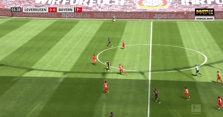 «Байер»… не сказать, что действовал первое время очень высоко в прессинге. Бос выстроил своих форвардов так, что они весь матч действовали едва ли не в линию, а к ним также подключалась пара Арангис – Баумгартлингер (чилиец чаще). Это в случае, когда мячом владеют центральные защитники мюнхенцев на своей половине поля. А вот когда «Бавария» вся на половине поля хозяев, то тут «Байер» уже серьезно поджимается, действуя достаточно низко. Порой до такой степени, что по картинке кажется – «аспириновые» в панике. Первое время это работало. И в этом случае развивать атаки гостям помогают только долгие комбинации с участием центрдефов и флангов.