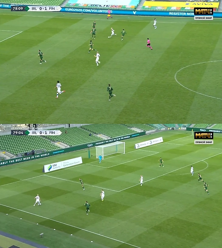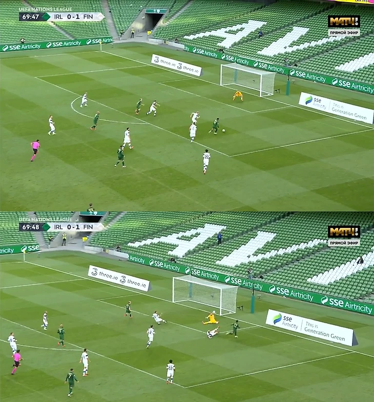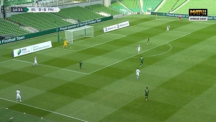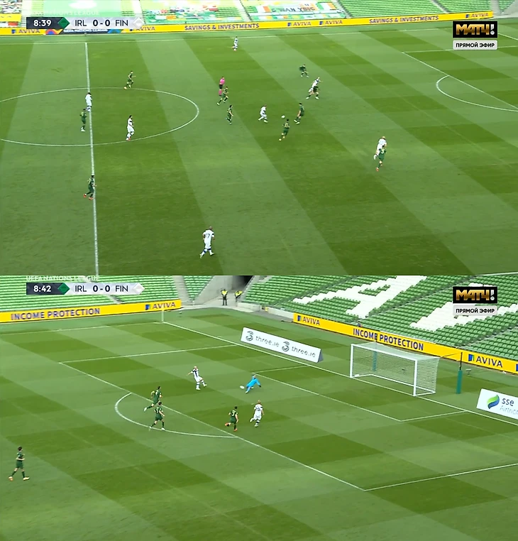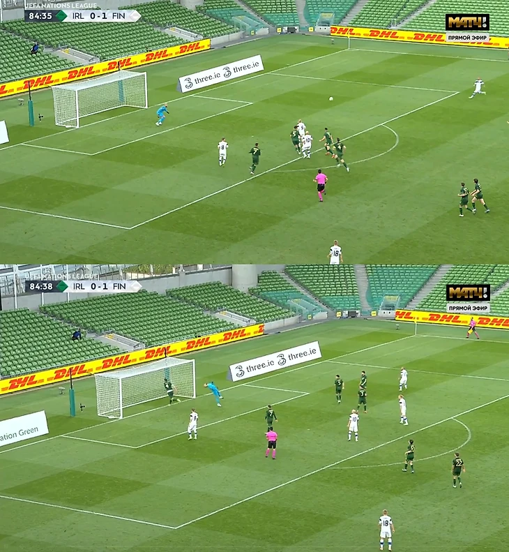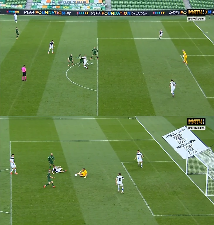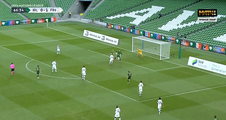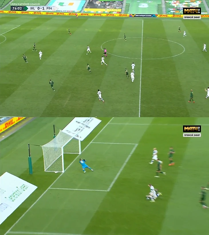 На самом деле игра в первой половине была более-менее равной. Да, ирландцы почаще были в атаке (что конкретно вылилось во владение 57% к концу тайма), но финны были как-то поубедительней, честно сказать. Их план работал на 0:0 – они не давали всерьез приблизиться к собственной штрафной, да и сами не превращали уже куда большее количество атак, что было по сравнению с Уэльсом, в результат. Вот здесь Камара вновь находит свободного Алхо, который убегает по флангу и вырезает отличный навес на Похьянпало. Но тот не может нормально положить корпус, поэтому бьет коряво. А с Уэльсом-то вообще сидели и не высовывались.