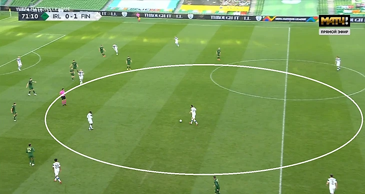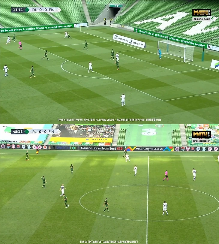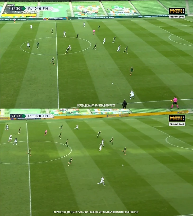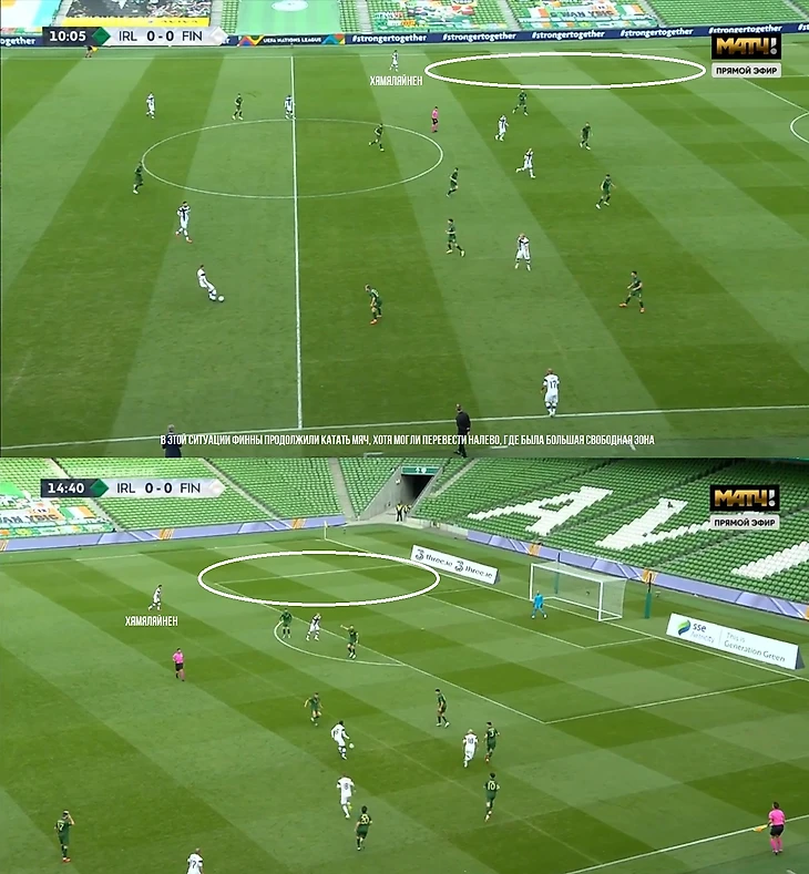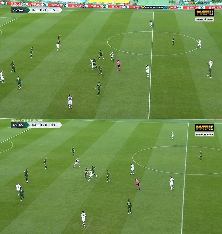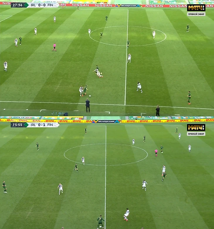 В первом тайме финны опять гнули свою линию с медленным развитием атак. Возможно, так они наоборот привлекали больше ирландцев на свою половину поля, выискивая возможность продвинуть вперед мяч. Главной идеей вновь стали забросы на правый фланг. Отвечавший за эту зону против валлийцев Нисканен был не столь убедителен, лишь пару раз в первом тайме воспользовавшись пустой зоной. На этот раз Алхо задействовали куда чаще, а свободным он оставался очень много раз. Этому помогали и движения самих ирландцев, которые смещались в сторону движения мяча.