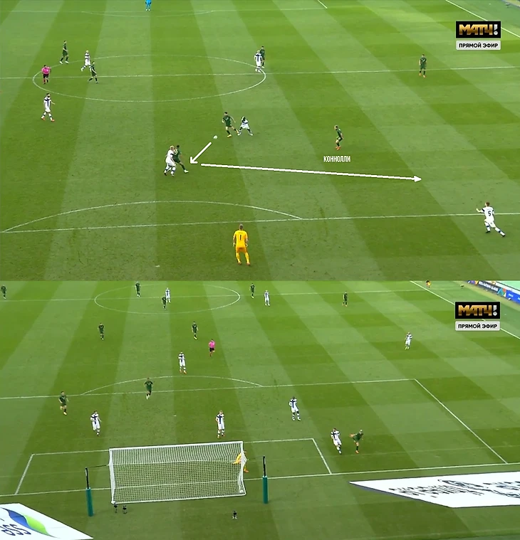 Три момента подряд. Сначала после подачи с фланга никто не коснулся мяча здесь. Убийственный момент, Коннолли должен был попадать по мячу.