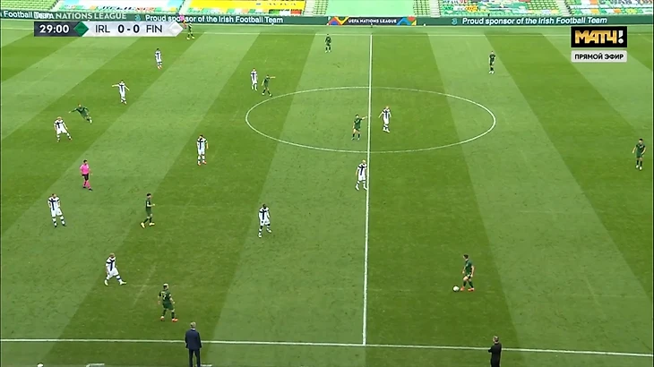 Пару штрафных ирландцев с ожидаемыми навесами на гренадера Даффи – скучно. А дальше начался открытый футбол, да. Резко появились свободные зоны из-за опаздывающих назад игроков – что там, что там были выходы к воротам. Сначала ирландцы закопались в чужой штрафной, когда можно было просто сразу стрельнуть с линии, а через несколько секунд финны даже дважды за минуту убегали в контратаку 2 в 2 и 3 в 3, но страдали передачи на партнера. Ирландцы предложили открытый футбол, в который финнам не стоило ввязываться. Забегая вперед, они невольно эту дуэль выиграли.