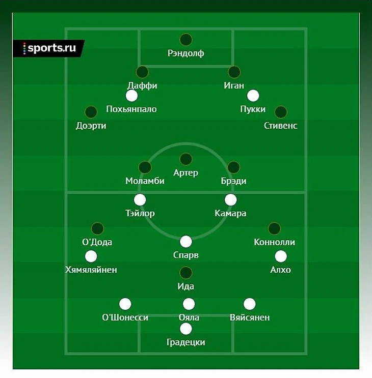 Первый тайм был равным, но крайне скучным. Одна команда желает и пробует играть в новый футбол, а со старого еще переключиться не может. Не помогает этому и новые имена в центре поля – Маккарти и Хурихэйн в запасе, а Моламби и вовсе дебютировал. Другая по своей судьбе тренирует сухие матчи, а наработанные связки и в целом организация игры только делает финнам услугу. Иногда это сбивается в открытый футбол, но со взаимными ошибками.