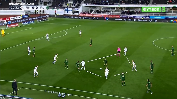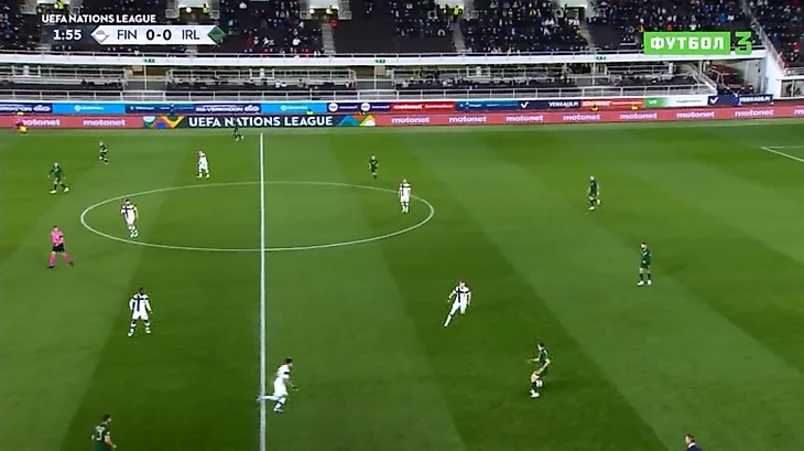 Из-за этого у финнов были большие проблемы с началом атак. Ирландцы втроем стояли у штрафной, поэтому защитная линия «Суоми» подолгу катала мяч туда-сюда. В большинстве своем первый пас вперед делал Градецки, вынося в центр поля на нападающих либо на фланг. И далеко не всегда успешно – лишь 57% точных передач за матч.