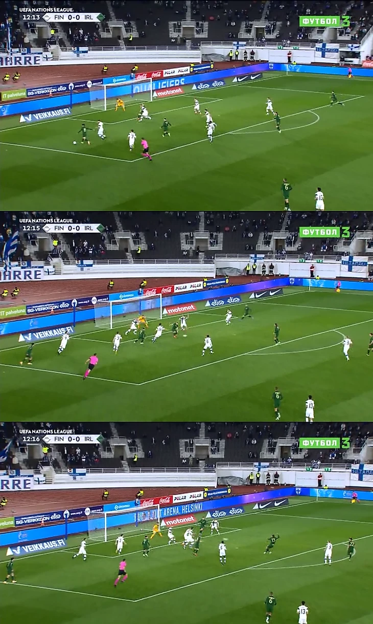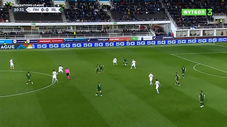Видно, что это наработанная комбинация, причем именно слева, но несколько таких попыток завершается выносом финнов. Слева ирландцы вообще много атак организовать пытались – и все из-за активности Коннолли. Форвард «Брайтона» затерзал Гранлунда, должен был сажать Спарва на желтую, часто бил из тех позиций, из которых только можно.
