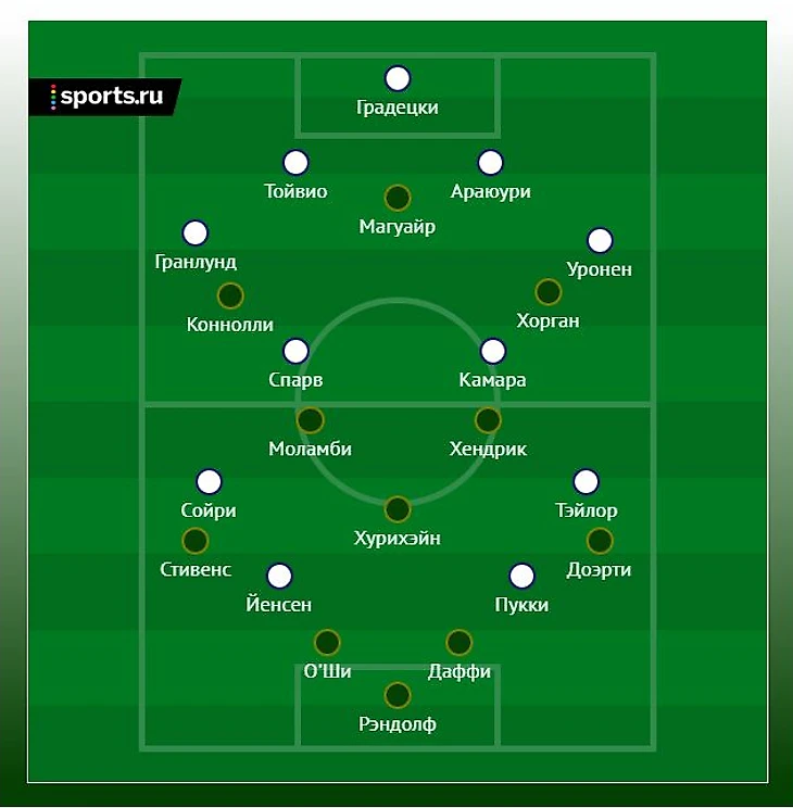 Момент на 12-й минуте. Сольный проход Магуайра прямо до штрафной, после чего идет пас в центр, Хорган отдает пас под удар Хендрику – блок Уроненом. А потому что быстро был сделан аут, опорная зона сначала не успела, потом потерялась.