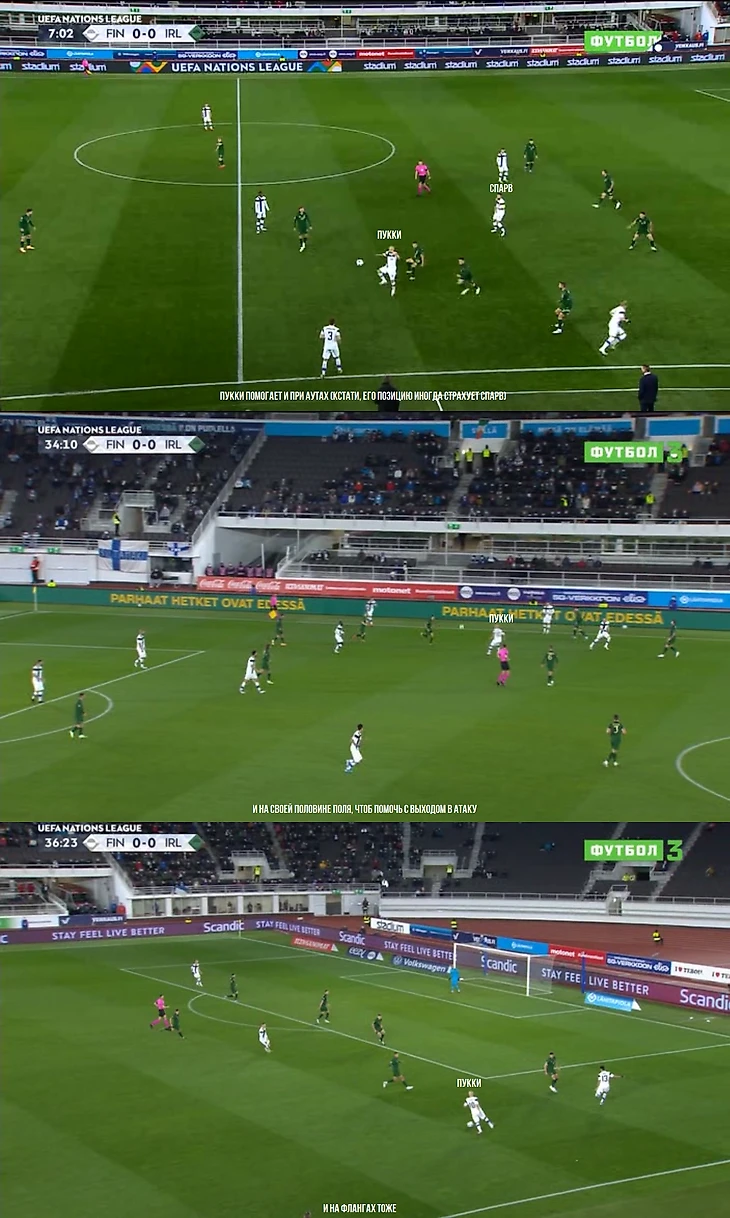 Центр поля – это крайне важное звено у финнов, так как Камара со Спарвом участвуют едва ли не во всех цепочках игры. Их задача – мелькать и успевать везде, где только можно, и в целом они с этим справляются. Разумеется, чтобы организовать атаку, кто-нибудь из них обязательно подбегает к линии защиты, а второй располагается чуть выше, неподалеку.