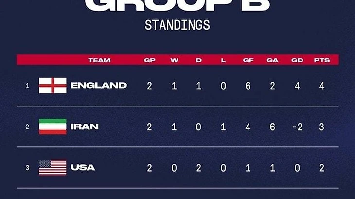 Вчера в соцсетях сборной США появилась таблица группы B после двух проведенных туров группового этапа ЧМ-2022. При этом на флаге Ирана нет эмблемы Исламской Республики – там только зеленая, белая и красная полосы.