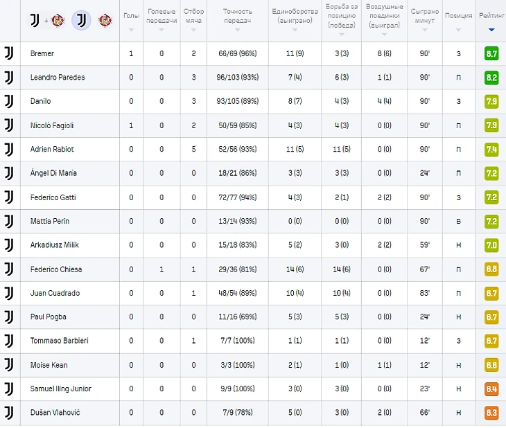 Оценки игроков «Ювентуса» за матч против «Кремонезе» от Sofascore