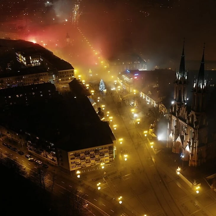 Затем в центре площади Костюшко фанаты с файерами выстроились в цифры 1920. День рождения клуба на самом деле в мае, но фанаты отмечают его в Новый год по юлианскому календарю.