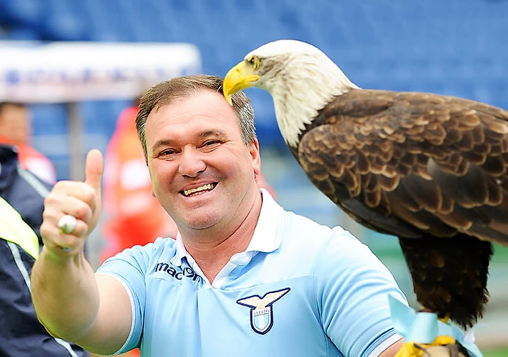 Как вы уже догадались, Олимпия – это имя орлицы, она больше 10 лет маскот «Лацио». А Хуан – это Хуан Бернабе, испанский сокольничий клуба, который как раз и заботится об этой великолепной птице.