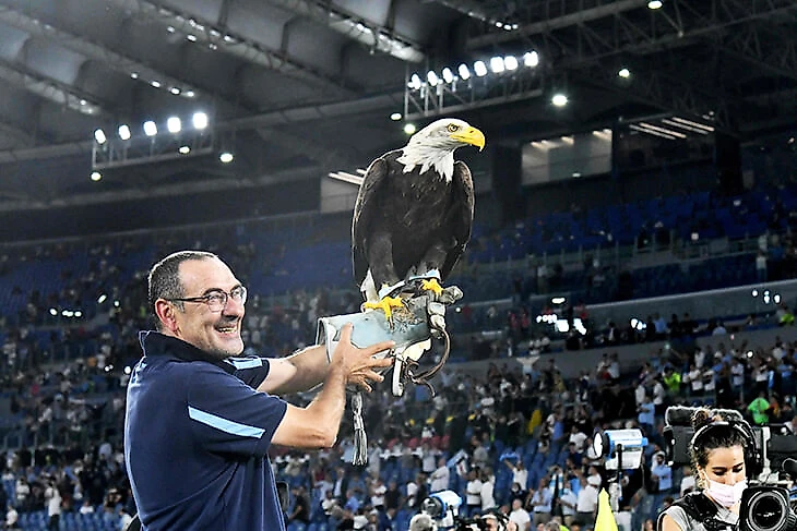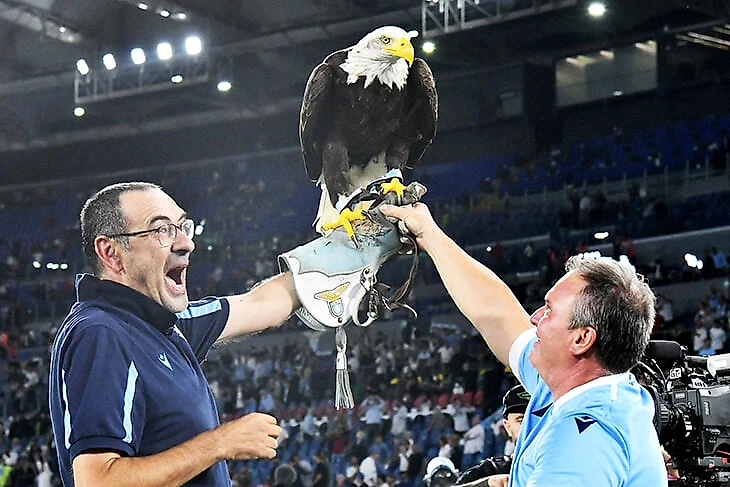 С орлицей на руке у фан-трибуны – так Сарри отпраздновал победу «Лацио» в римском дерби. Разделил счастье с живым маскотом