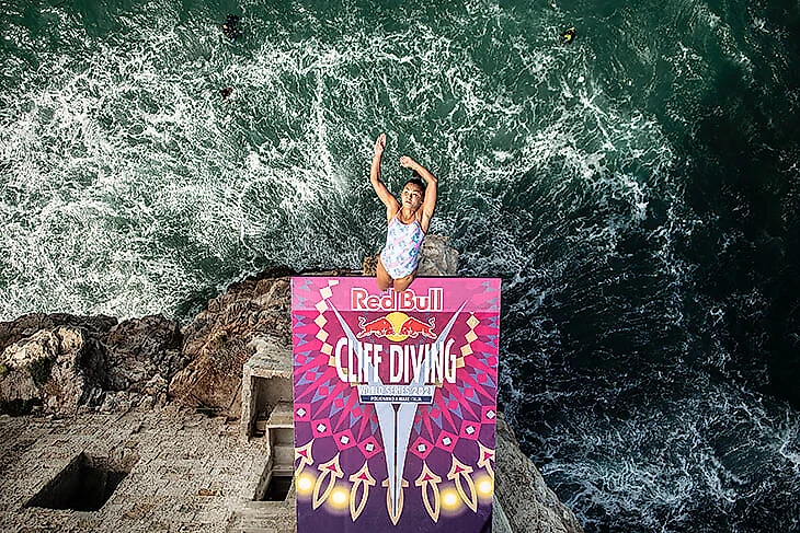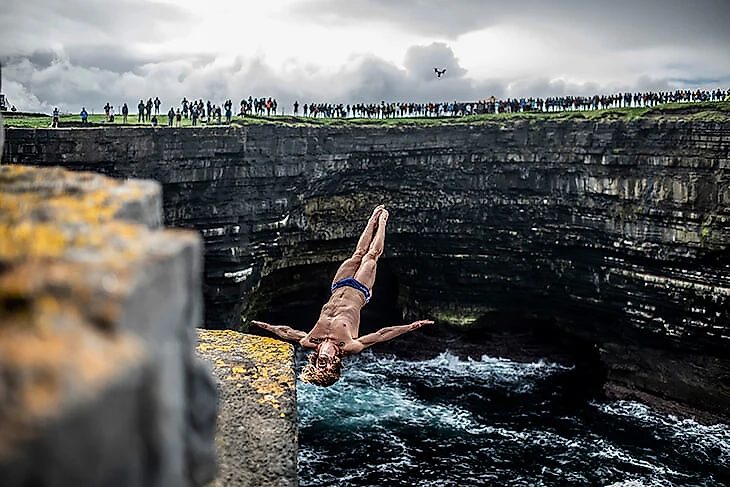 11 сентября. Красота с соревнований по клифф-дайвингу, болельщики и дрон наблюдают за прыжками с мыса Даунпатрик-Хэд в Ирландии.