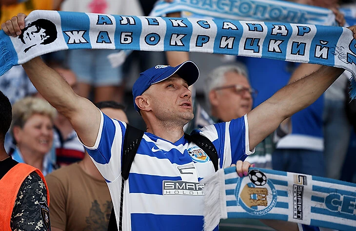 Один из самых ярких фанатов – мужчина с шарфом в честь Александра Жабокрицкого. Он отыграл за «Севастополь» 255 матчей и забил 40 голов. С 2019-го тренирует детей в академии.