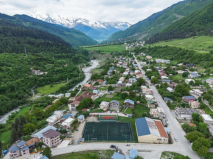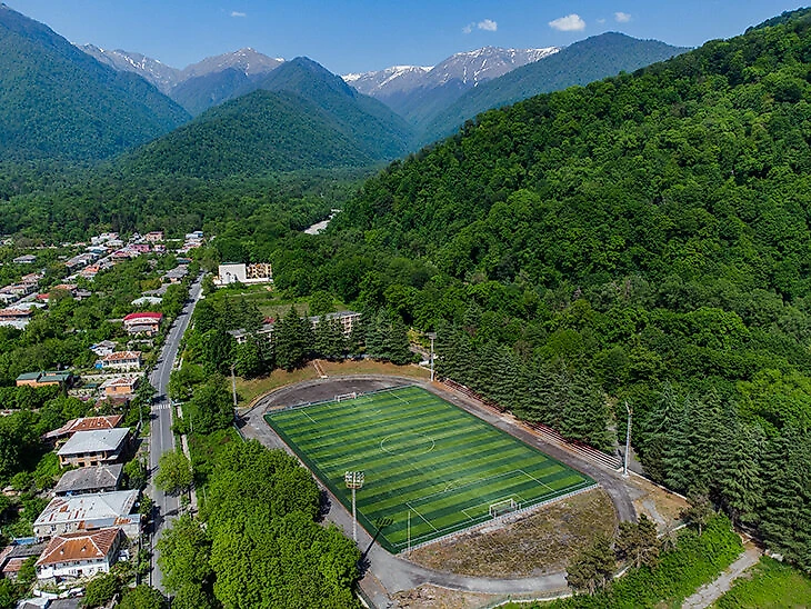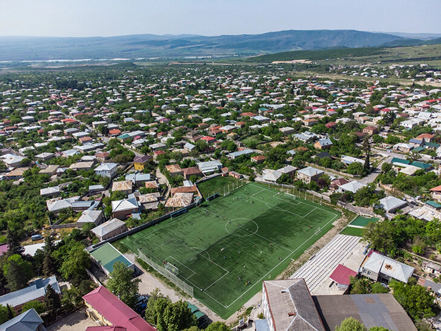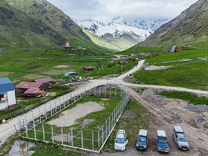 Футбольное поле в Местии. Уникальный случай для Грузии – искусственное. Тут очень холодно зимой, регион Сванетия один из самых высокогорных в стране.