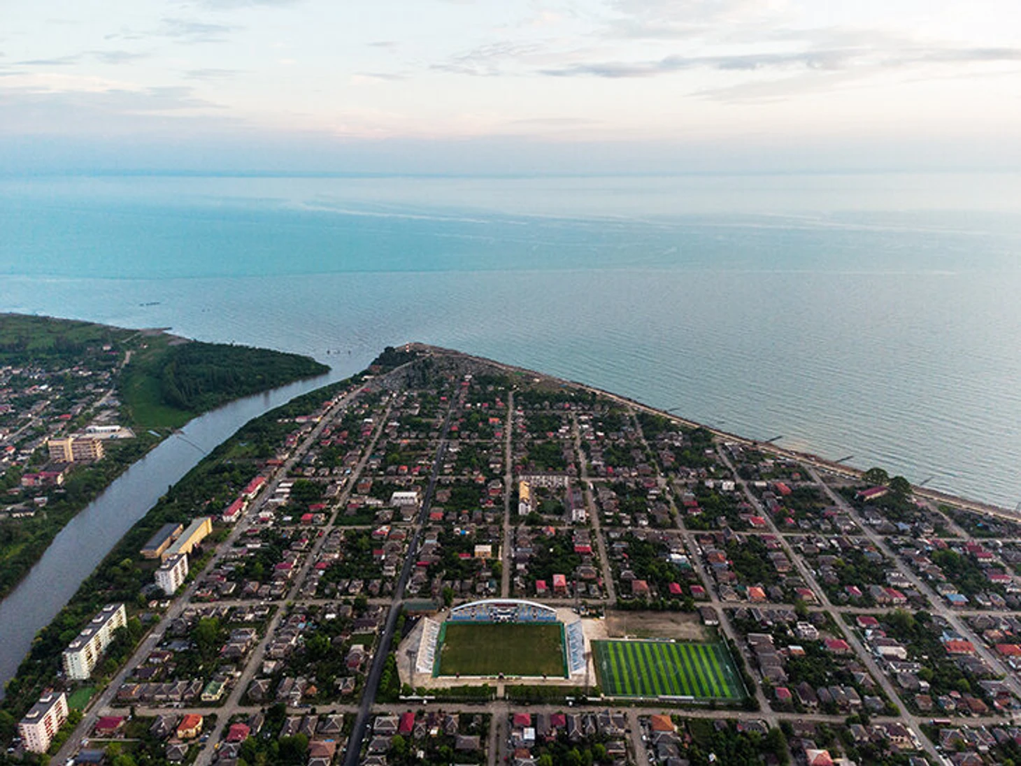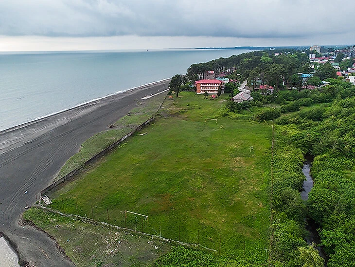 Стадион в квартальной застройке почти на берегу моря. Это Поти, главный морской порт Грузии.
