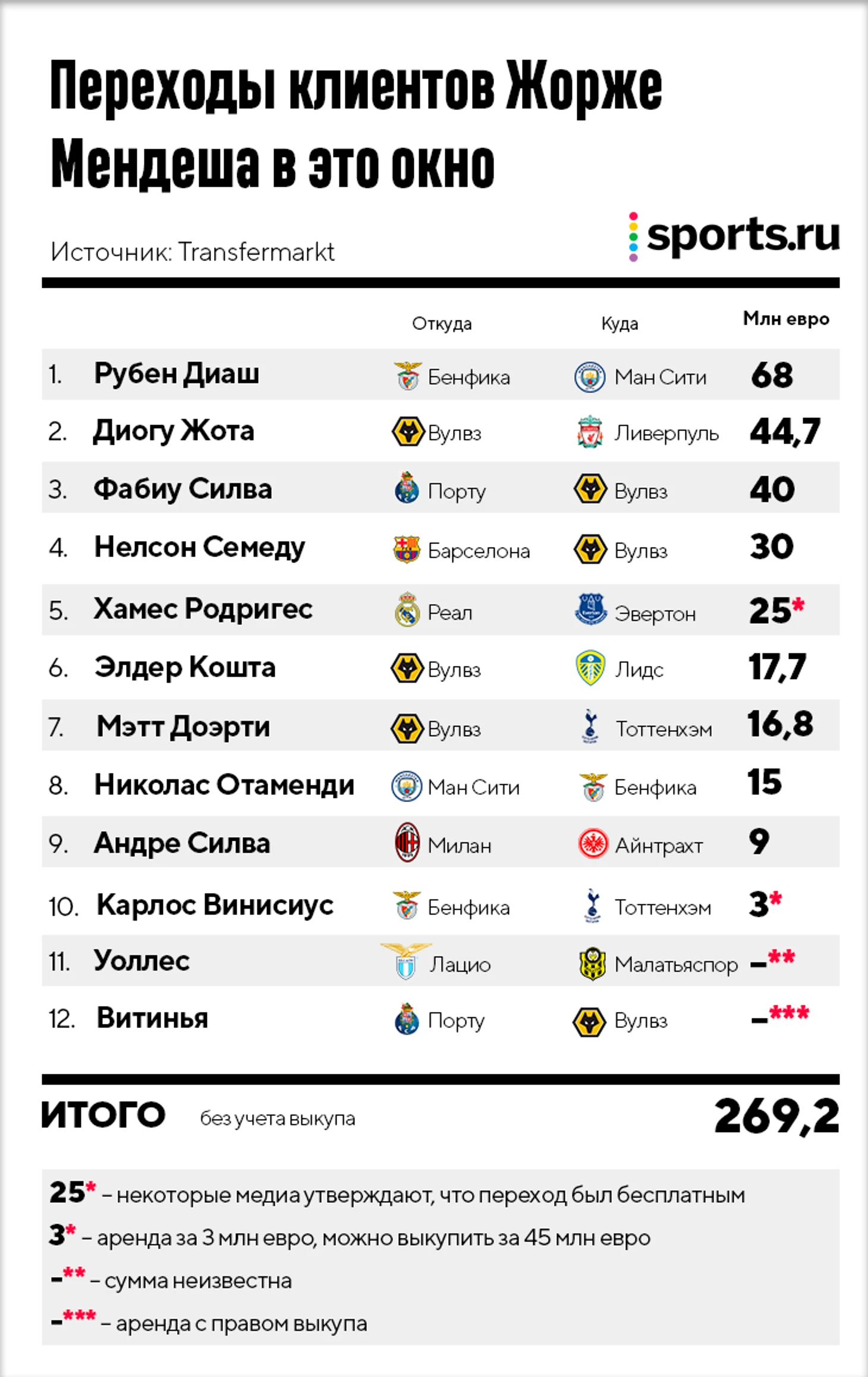 Главных клиентов Мендеша среди клубов видно по таблице выше: с «Порту» Жорже сотрудничает больше 20 лет, «Вулверхэмптон» принадлежит китайскому конгломерату Fosun International, который также владеет миноритарным пакетом акций Gestifute (агенство Мендеша) – отсюда такое количество миграций клиентов Жорже в «Вулвз».