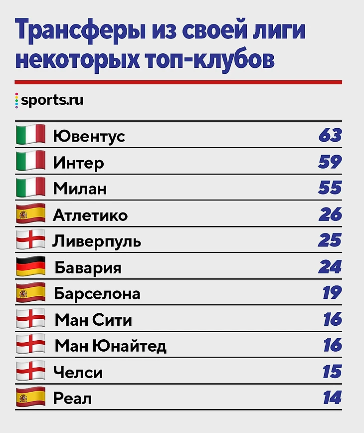 Так, а 12 трансферов из своего чемпионата – это много или мало? Давайте сравним с другими топ-клубами.