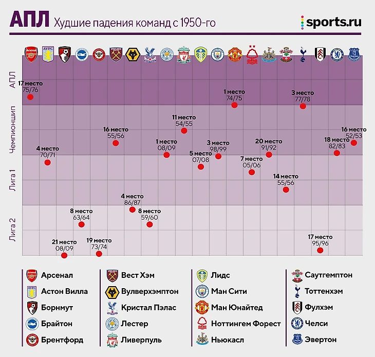 Худшие падения клубов АПЛ: «Арсенал» был 17-м (но не вылетал), «Сити» играл в первой лиге, «Челси» – на дне Чемпионшипа