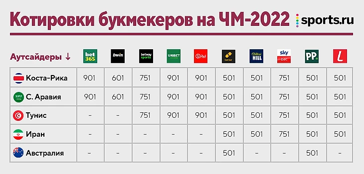 • Никто из букмекеров не верит в Коста-Рику и Саудовскую Аравию.
