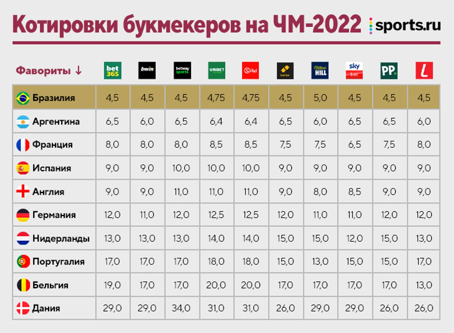 Кого букмекеры считают фаворитом? Бразилия чемпион, топ-10 у всех одинаковая