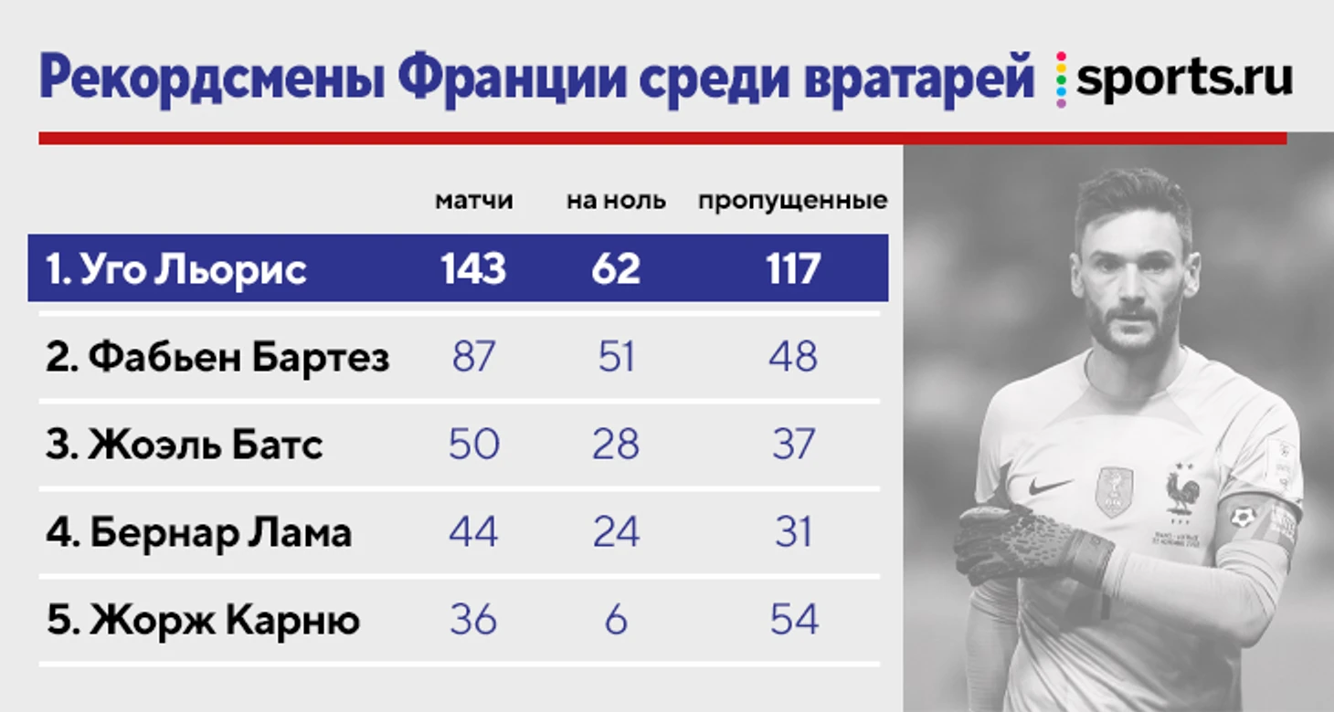В матче с Англией Уго Льорис обогнал Лилиана Тюрама и стал рекордсменом сборной Франции (143 матча). Уго провел 4 ЧМ (2010, 2014, 2018 и 2022) и 3 Евро (2012, 2016, 2020) как основной вратарь сборной.