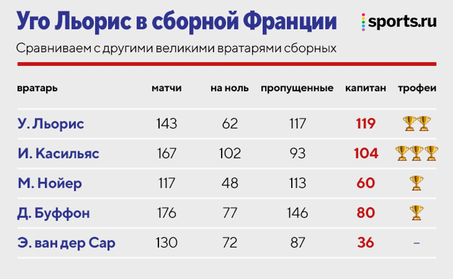 Чтобы осознать масштаб достижения, мы сравнили Льориса с четырьмя другими легендарными киперами, которые много лет олицетворяли свои сборные. Это не попытка выявить лучшего (тягаться в величии с Буффоном и Касильясом просто нереально), а скорее комплимент для Уго. Да, добраться до высоченной планки ван дер Сара и Нойера непросто, но кое в чем обойти их все-таки можно.