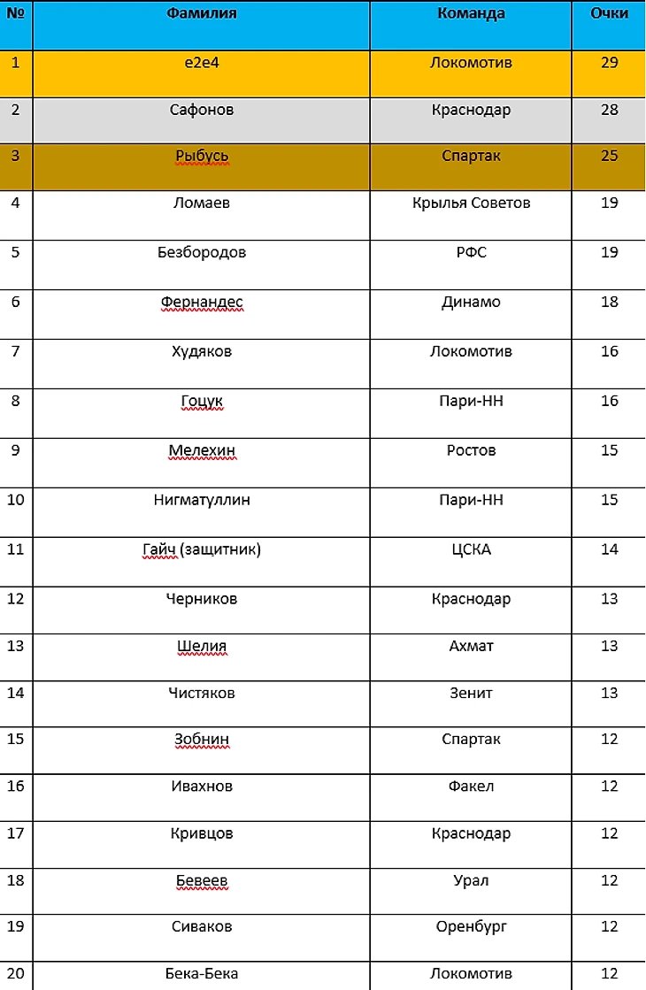 На четвертой строчке оказались сразу два горе пенальтиста, которые блеснули мастерством в минувшем туре - это Мирзов из Химок и Кузяев из Зенита, а мы напоминаем, что не реализованный пенальти оценивается в 5 баллов трупДжи.