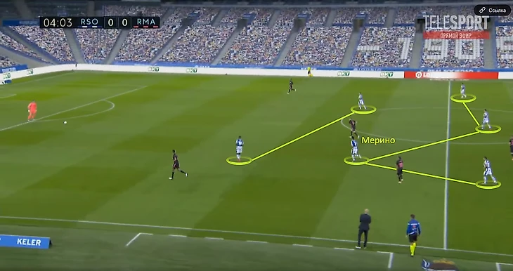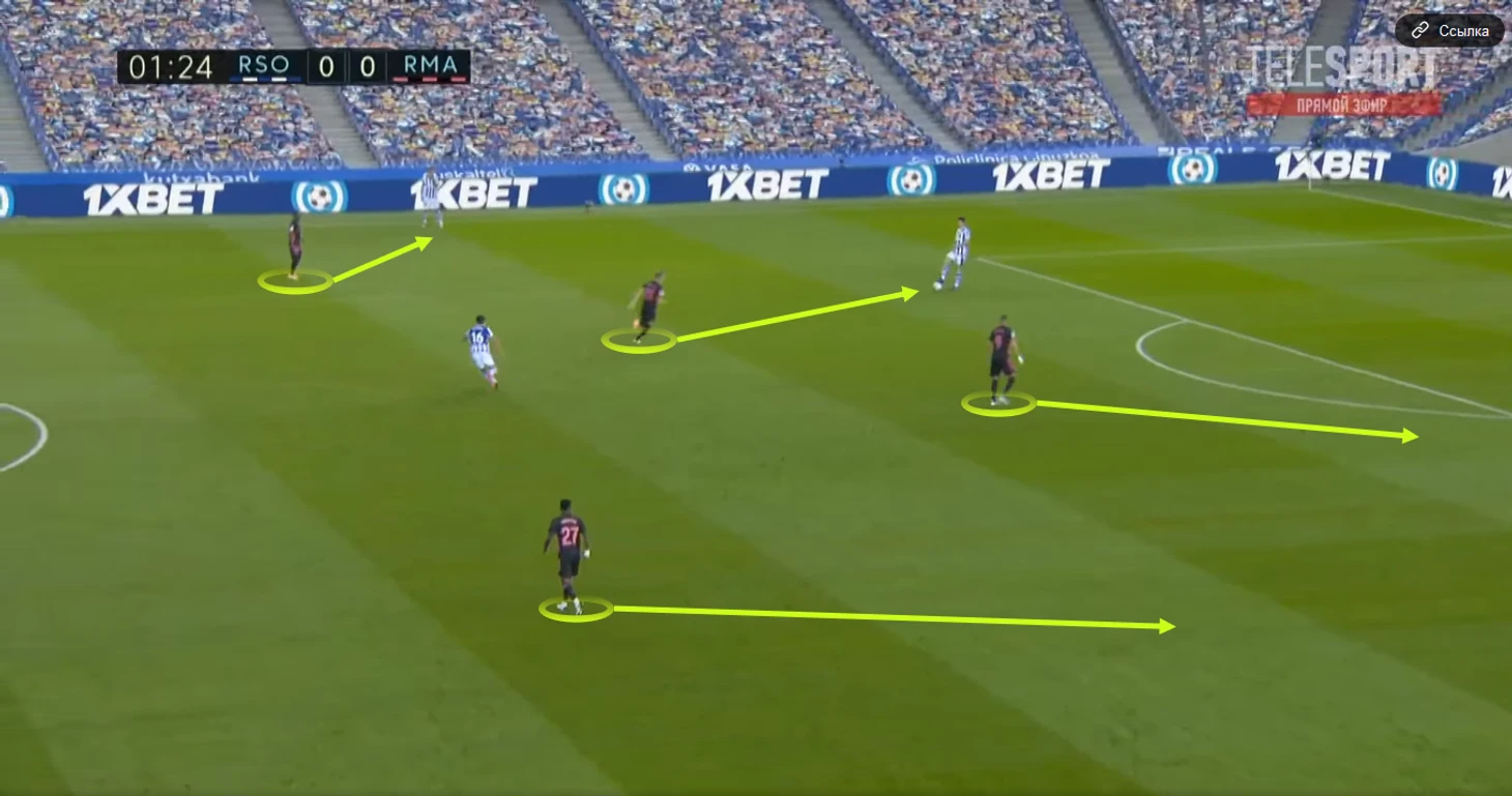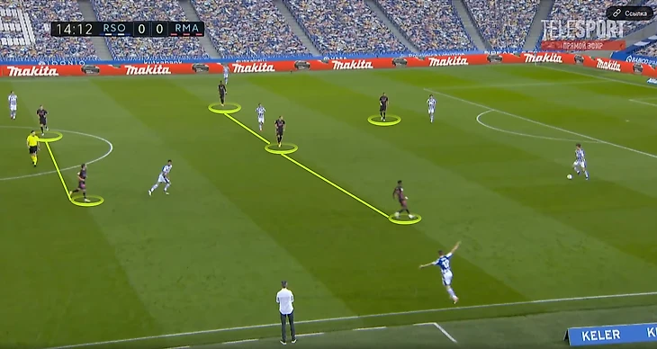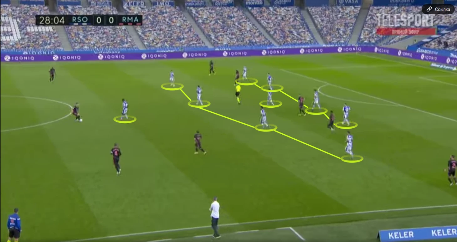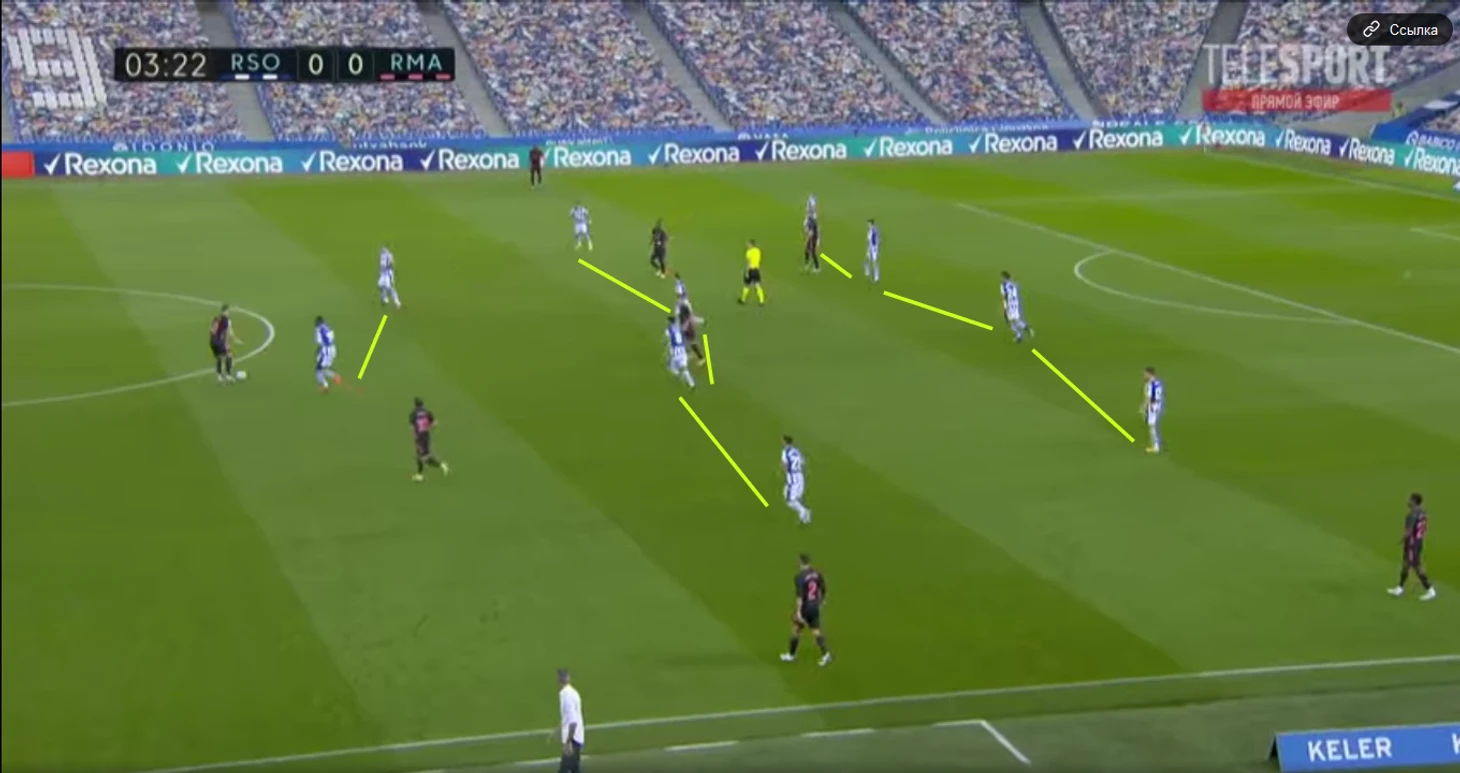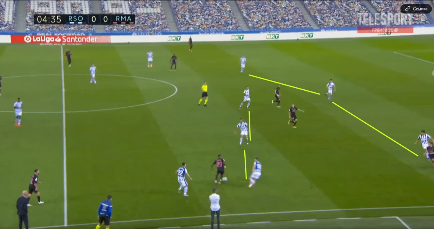 Несмотря на попытки адаптироваться к билдапу соперника, прессинг «Сосьедада» на старте не был в полной мере удачным – опускания Модрича и Крооса всё равно работали, нередко «Реал» выходил в атаку низом, а моментов из прессинга на этом отрезке баски, разумеется, тоже не выжали.