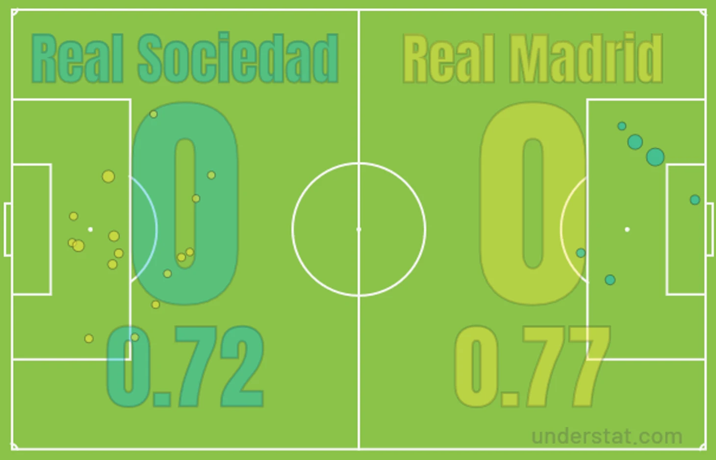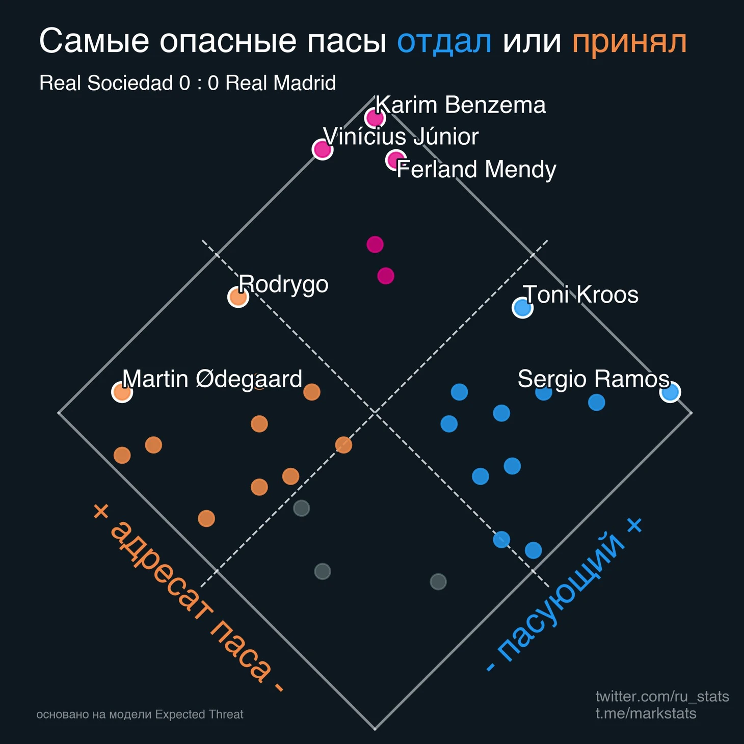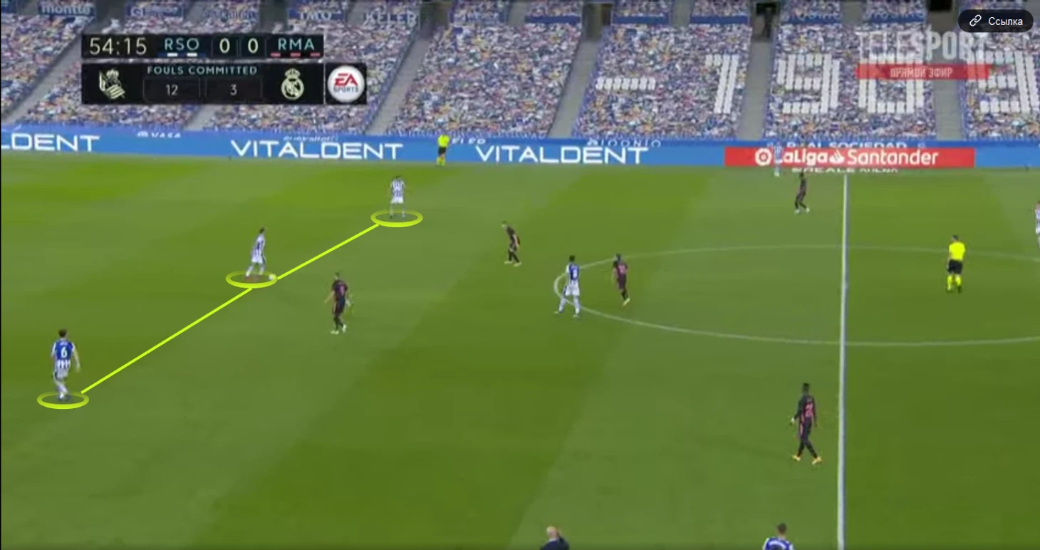 Такой билд-ап, как на иллюстрации выше, позволяет создать ситуацию 3v2 в первой стадии – это зачастую ведёт к падению интенсивности прессинга. Правильное решение, но пораньше бы... Важно: на оставшейся дистанции матча «Реал Сосьедад» так и не вернул себе владение и территорию, но: а) у «Реала» не было такого преимущества, как в середине первого тайма; б) явных моментов Мадрид тоже не создал. Выводы «Во втором тайме нам было сложно забрать мяч, но мы можем быть довольны тем, как была организована защита. Если мы не забиваем голы, мы должны стараться поддерживать структуру и ничего не пропускать. У нас хорошие игроки высокого уровня, сегодня Кариму Бензема просто не повезло. Мы можем забивать. Мы видим это на тренировках, так было в игре с «Хетафе». Иногда мяч не хочет попадать в ворота, сегодня нам не повезло, но голы придут», - резюме от Куртуа. Тибо предельно адекватно подвёл итоги матча – «Реалу», особенно во втором тайме, было сложно атаковать, похвально, что не рассыпались в обороне и всё равно сохраняли баланс. У хозяев не было опасных контратак – в этих ситуациях хорошо проявил себя Варан, который грамотно выбрал позицию в двух эпизодах с потенциальными выходами 2v2 на случай, если его отрежут передачей. «Реал Сосьедад» и лично Альгуасиль тоже могут занести эту игру себе в актив, хотя они снова набрали меньше 1 xG за игру, но в матче против «Реала», какой бы стиль ни ставил тренер, важнее сдержать соперника – это действительно получилось. Из негативного можно отметить проблемы Мадрида с последним пасом. Куртуа говорил про невезение, но конкретное слово здесь не совсем уместно, так как непосредственно моментов, несмотря на достаточное количество остроты, не было.