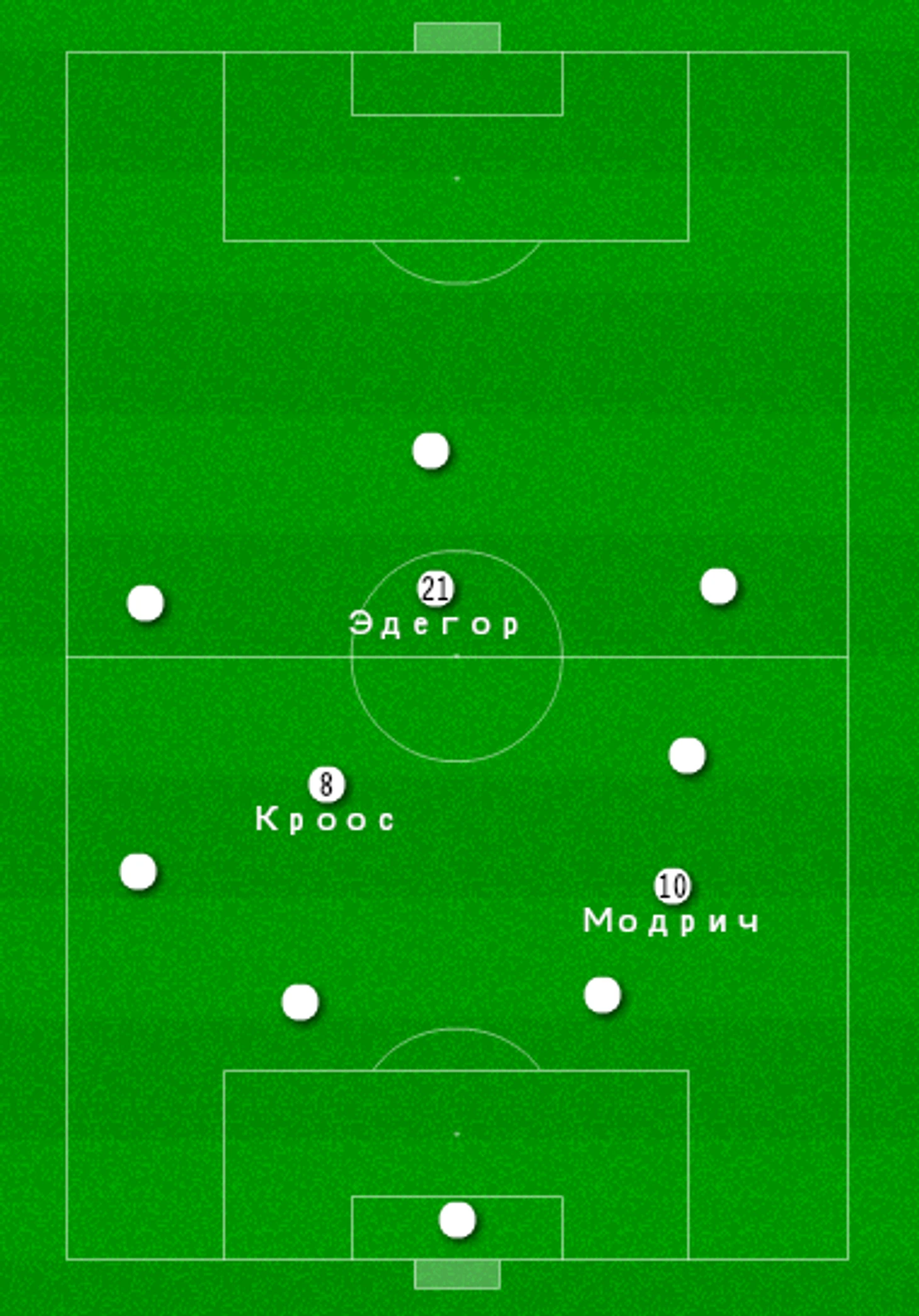 По этой причине такое взаимное расположение центральных полузащитников (Эдегор – выше, Модрич и Кроос – ниже) предугадывалось ещё до матча. При прессинге Эдегор выдвигался на одну линию с Бензема – так очень удобно зеркалить расстановку команды, которая выбрала схему 4-4-2