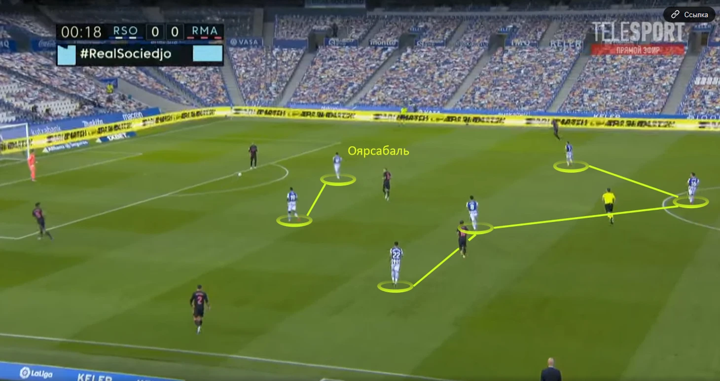 Примерно с 30-й минуты в среднем и низком блоке Сан-Себастьян стал чередовать схему 4-1-4-1 и ранее используемую 4-4-2 – всё менялось с помощью смещений вглубь Оярсабаля на один уровень с Мерино и Геварой, в зону под ними