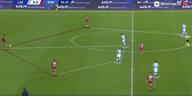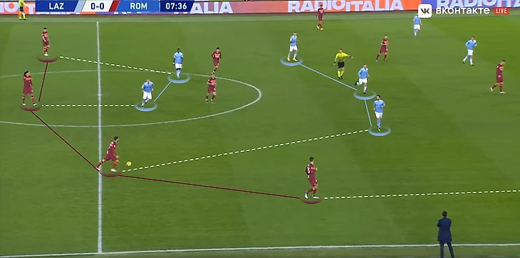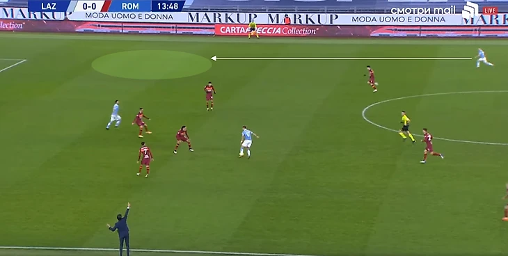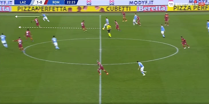 Теперь Пеллегрини стал чаще опускаться не в правый полуфланг, а в левый. То есть, в зону, где непосредственно схема перестраивается из 5-3-2 в 5-2-3, что в теории могло принести сложности «Лацио»: если в зону, где находится Милинкович-Савич, не сместится Лейва либо Ладзари, «Рома» в какой-либо форме получает численное преимущество – либо больше времени и пространства у Пеллегрини, либо – у Манчини.