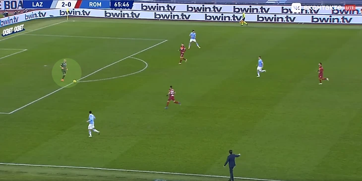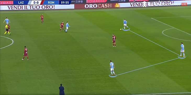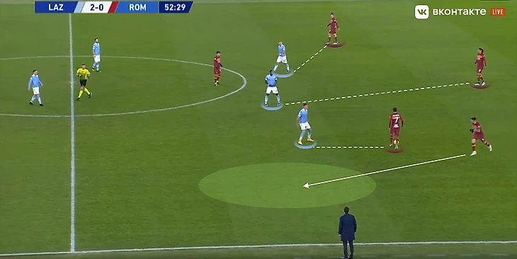 Ситуация перед третьим голом: «Лацио» при помощи смелого билдапа (Рейна и Ачерби образуют пару центральных защитников) удалось выманить «Рому» в прессинг, после чего началась голевая атака