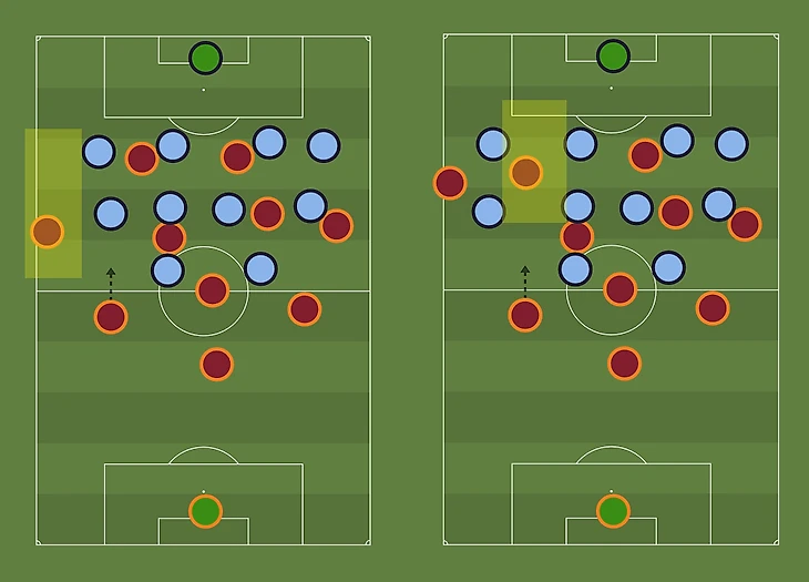 У Луиса Альберто была, пожалуй, более специфическая роль: к нему часто опускался Лоренцо Пеллегрини (между Смоллингом и Манчини, либо просто вместо Манчини) – надо было реагировать. Вариант на иллюстрации слева был более простым – Пеллегрини просто занимает место Манчини, перегруза в зоне нет, так как крайний центральный защитник фактически не участвует в розыгрыше. Альберто достаточно неагрессивно (остановиться в 1-1,5 метрах от игрока, не вступать в отбор) выдвинуться в сторону Пеллегрини, Карсдорпа контролирует Марушич. Вторая ситуация чуть сложнее, учитывая, что в эпизод включился и Манчини, и здесь «Лацио» действует более рискованно: Альберто снова обозначает давление в сторону Пеллегрини, на Манчини, когда тот немного продвинется вглубь, чуть позже выдвинется Марушич (латераль против крайнего центрального защитника). «Лацио» прекрасно справился в обороне по первому тайму: «Рома» нанесла всего лишь три удара, два – из штрафной, общий вес (по Understat) – 0,13 xG.