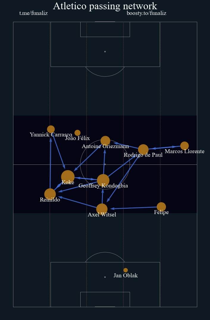 Таким образом, итоговое территориальное превосходство "Атлетико" продиктовано не только течением матча — с самого начала у Симеоне был запрос на отрезки контроля мяча/пространства.
