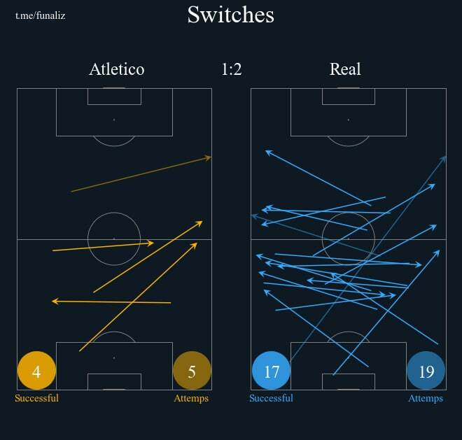 Коке мало ошибался, а если и делал это, то, как правило, в ситуациях, когда он искал более рискованные передачи. Его солидный перфоманс в созидании — одна из причин, по которым "Реалу" удавалось запрессинговать не так много владений "Атлетико" — всего 27,3%. И это при том, что команда Симеоне не была нацелена упрощать игру в билдапе — Облак отдал всего три длинные передачи с игры.