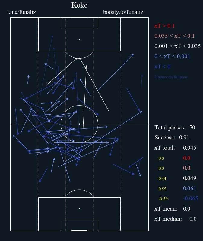 Но, кроме билдапа и развития атак, капитан "Атлетико" отдавал и под удар — в частности, Карраско открылся между линий, после чего был близок к выходу один на один (один из самых опасных моментов у хозяев с игры) именно после вертикальной передачи от Коке, которая была частью длительного владения.