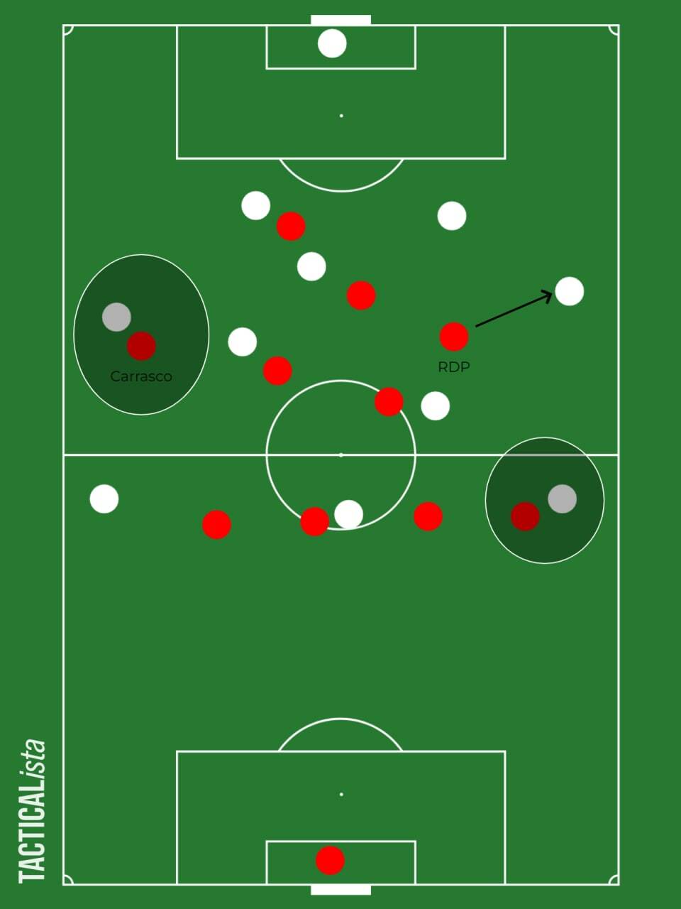 В билдапе "Атлетико" часто делает акцент на левый фланг — не новая тенденция, для которой достаточно причин: туда тяготеет Жоао Феликс (в дерби собирал там фолы), на том же фланге раньше играл Марио Эрмосо — центральный защитник "Атлетико" с лучшим пасом (сейчас выходит реже, но паттерны, вероятно, остались), плюс логично отправлять сильного 1v1 Карраско в более высокие позиции в атаке.